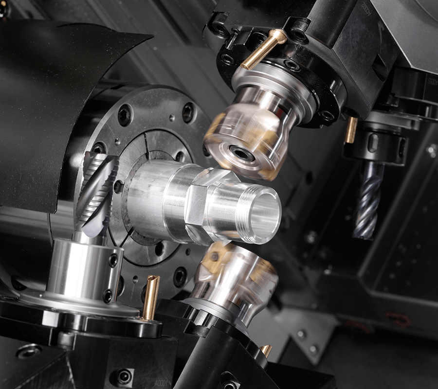 利用搭载Y轴功能的上下刀塔和左右轴的同步加工,可短时间完成工件的内外加工